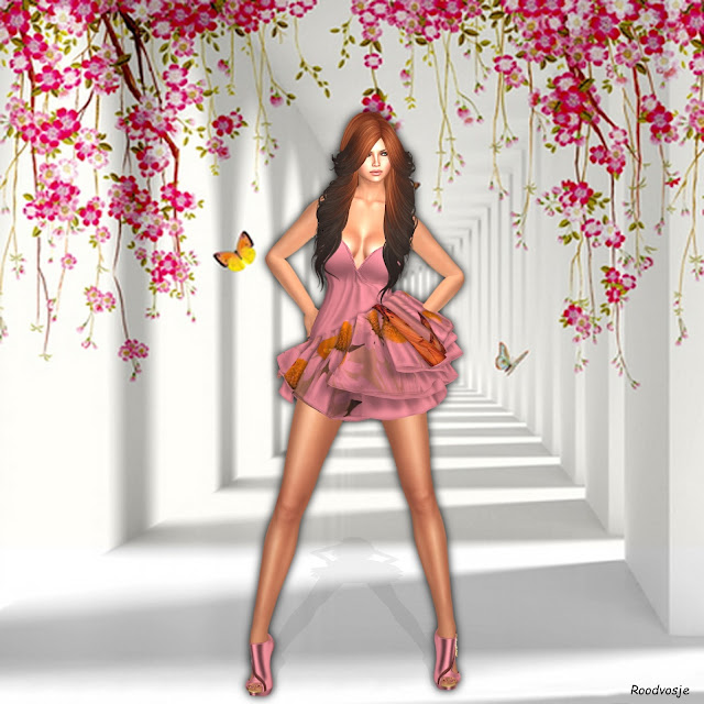 But let me start with the Designer Circle. I found this lovely Carolina pleated mini skirt by Gemyles there. This lovely dress comes with the matching shoes for Slink high feet, and with a colour change HUD which changes the dress and the shoes into 32 colours. But that is not all, you get 32 plain colours to choose from and 32 flower textures colours! Showing you a few options below so you get an impression of what is possible.